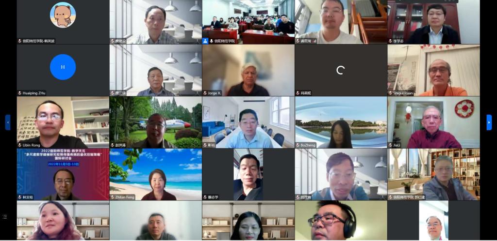11月5日上午,由信阳师范学院承办的“国家自然科学基金天元数学国际研讨会”在 自慰a片 线上隆重开幕。出席开幕式的特邀专家有:加拿大约克大学的Wu Jianhong院士,美国阿拉巴马大学的Li Jia教授,美国国家自然科学基金委暨普渡大学的Feng Zhilan教授,美国杜兰大学Hyman James Mac教授,墨西哥UNAM-Juriquilla大学Jorge X.Velasco-Henández教授,美国迈阿密大学Ruan shigui 教授,加拿大纽芬兰纪念大学Zhao Xiaoqiang教授,加拿大约克大学的Zhu Huaiping教授,佛罗达大学Rong Libin教授,国家杰青、广州大学庾建设教授,中国生物数学学会理事长、北京建筑科技大学崔景安教授,中国生物数学副理事长、山西大学靳祯教授,中国生物数学副理事长、西安交通大学肖燕妮教授,中国生物数学副理事长、河南财政金融学院校长李学志教授等,以及来自国内外30余所高校近200多名师生线上参加了开幕式。开幕式 自慰a片 院长蔡礼明教授主持。