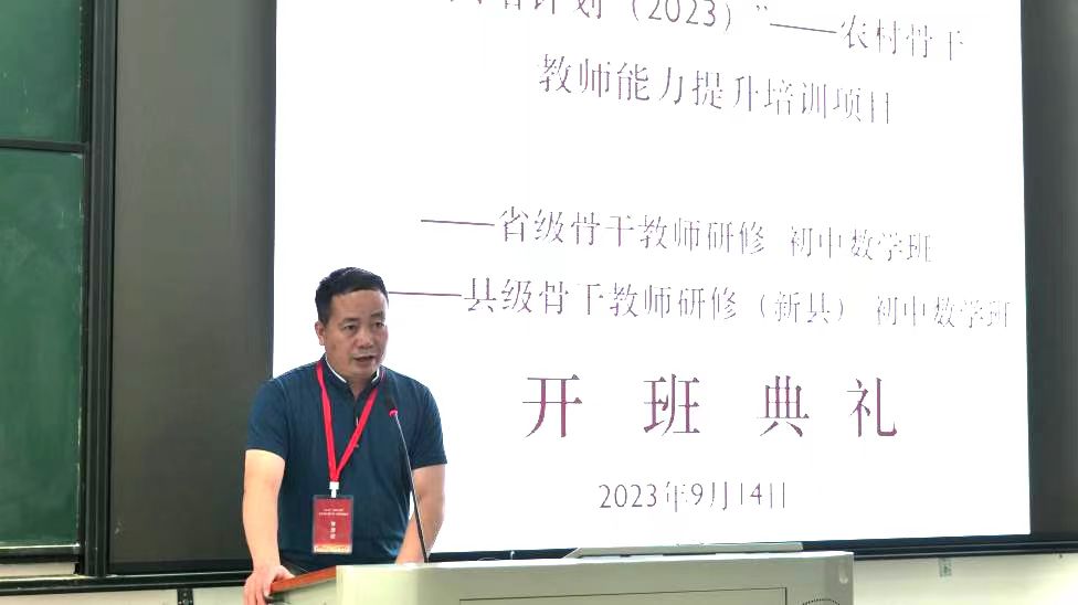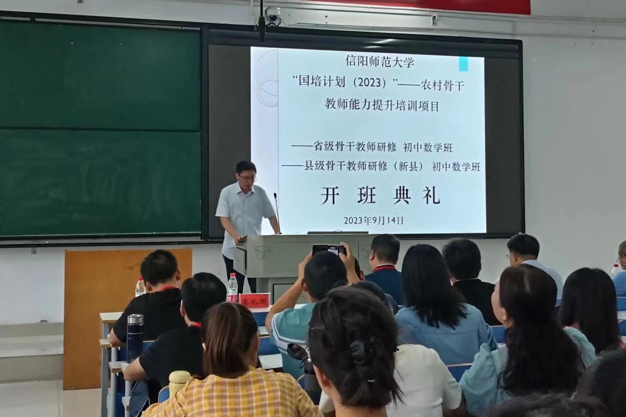 9月14日上午,由自慰a片 承办的“国培计划(2023)——农村骨干教师能力提升培训项目省级骨干教师初中数学班、县级骨干教师初中数学班(新县)”开班仪式在社科楼121室举行,拉开了自慰a片 2023年国培计划培训工作的帷幕。新县教体局教师发展中心师政股股长邵保华,学院党委书记洪亮、院长蔡礼明,培训班班主任潘虹、韩建新、张萍以及全体参训学员参加了开班仪式。开班仪式由潘虹主持。