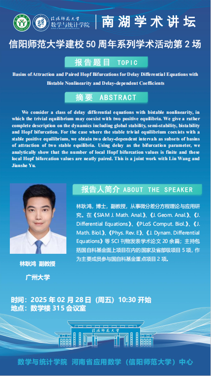 庆建校50周年之南湖讲坛: 广州大学林耿鸿副教授——Basins of Attraction and Paired Hopf Bifurcations for Delay Differential Equations with Bistable Nonlinearity and Delay-dependent Coefficient