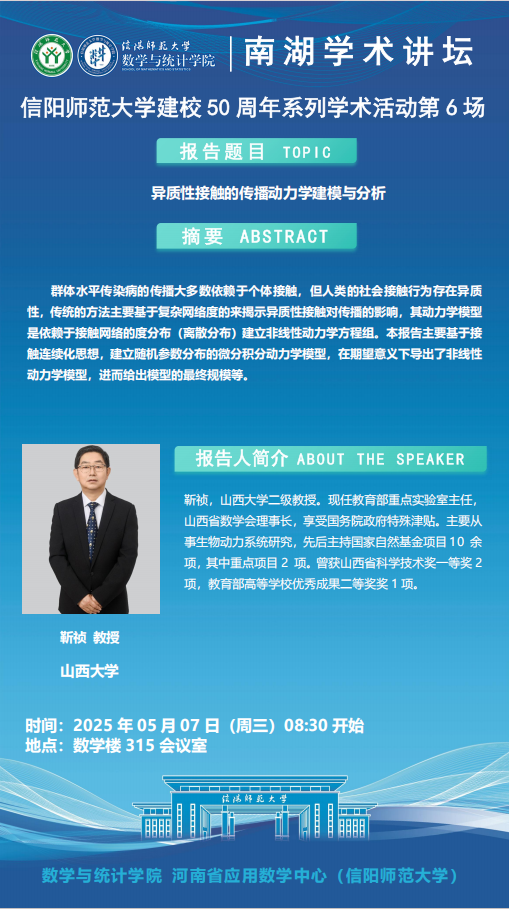 庆建校50周年之南湖讲坛:山西大学靳祯教授——异质性接触的传播动力学建模与分析