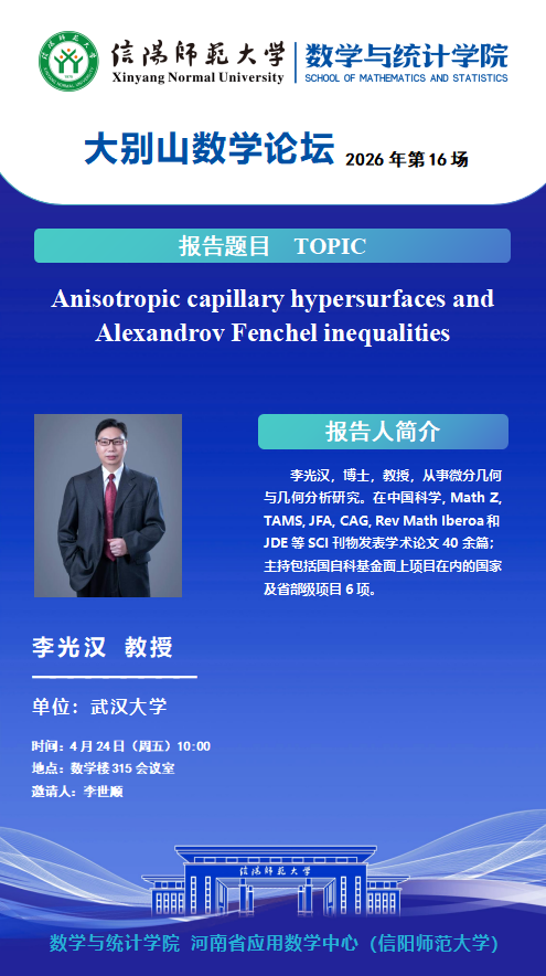 大别山数学论坛:武汉大学李光汉教授——Anisotropic capillary hypersurfaces and Alexandrov Fenchel inequalities
