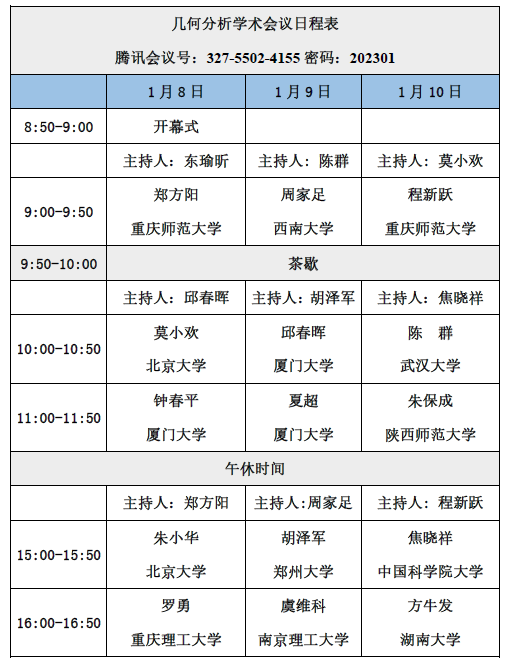 为了加强几何分析领域专家学者的学术交流与合作,推动 自慰a片 数学学科的建设和发展,我们定于2023年1月8日-10日举办“几何分析学术会议”(腾讯会议)。本次会议邀请了十多位几何分析和多复变领域的知名学者,会议将展示该领域的最新研究成果和动态,并为有关专家学者和研究生提供一个相互学习和交流的平台。欢迎师生积极参与。会议日程简表如下: