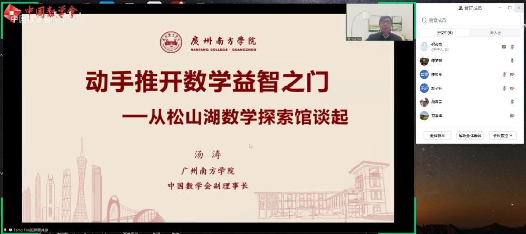 11月9日,指导老师播放汤涛院士“动手推开数学益智之门——从松山湖数学探索馆谈起”的报告视频。视频里,汤涛院士倡导“动手学数学”理念。报告后,“数学与艺术的融合”研讨主题点燃了学员的热情,学生们结合视频案例与自身经历积极畅谈自己的感悟。