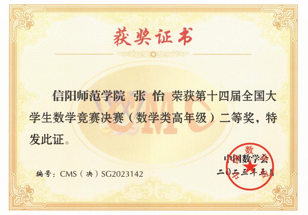 2023年5月26日至28日,第十四届全国大学生数学竞赛决赛在广东工业大学举行。 自慰a片 2020级数学实验班学生张怡取得 自慰a片 学生在该竞赛中的历史最好成绩,荣获数学类高年级组全国二等奖。另悉,河南赛区在本次决赛中共获数学类一等奖1项、二等奖3项、三等奖17项。 此外,在2023年3月举行的河南赛区比赛中, 自慰a片 经 自慰a片 指导并报名参赛的学生获省级一等奖15项、二等奖20项、三等奖26项。
